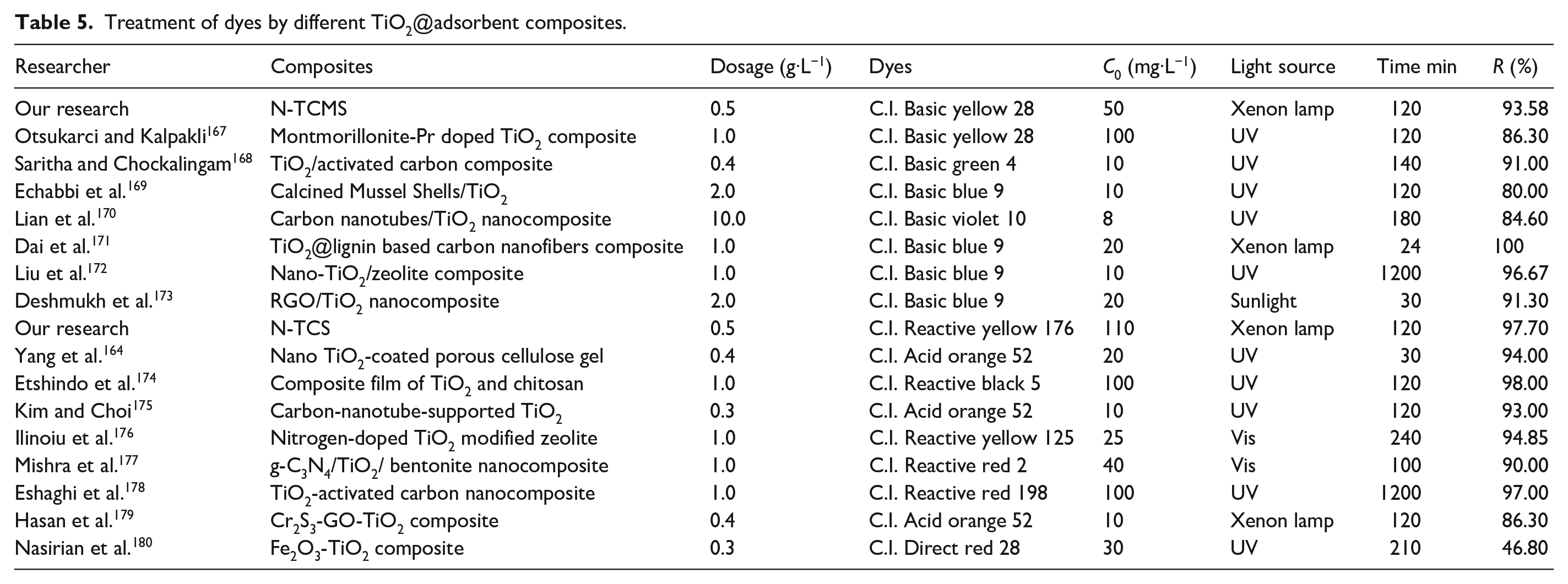 Treatment of dyes by different TiO2@adsorbent composites.