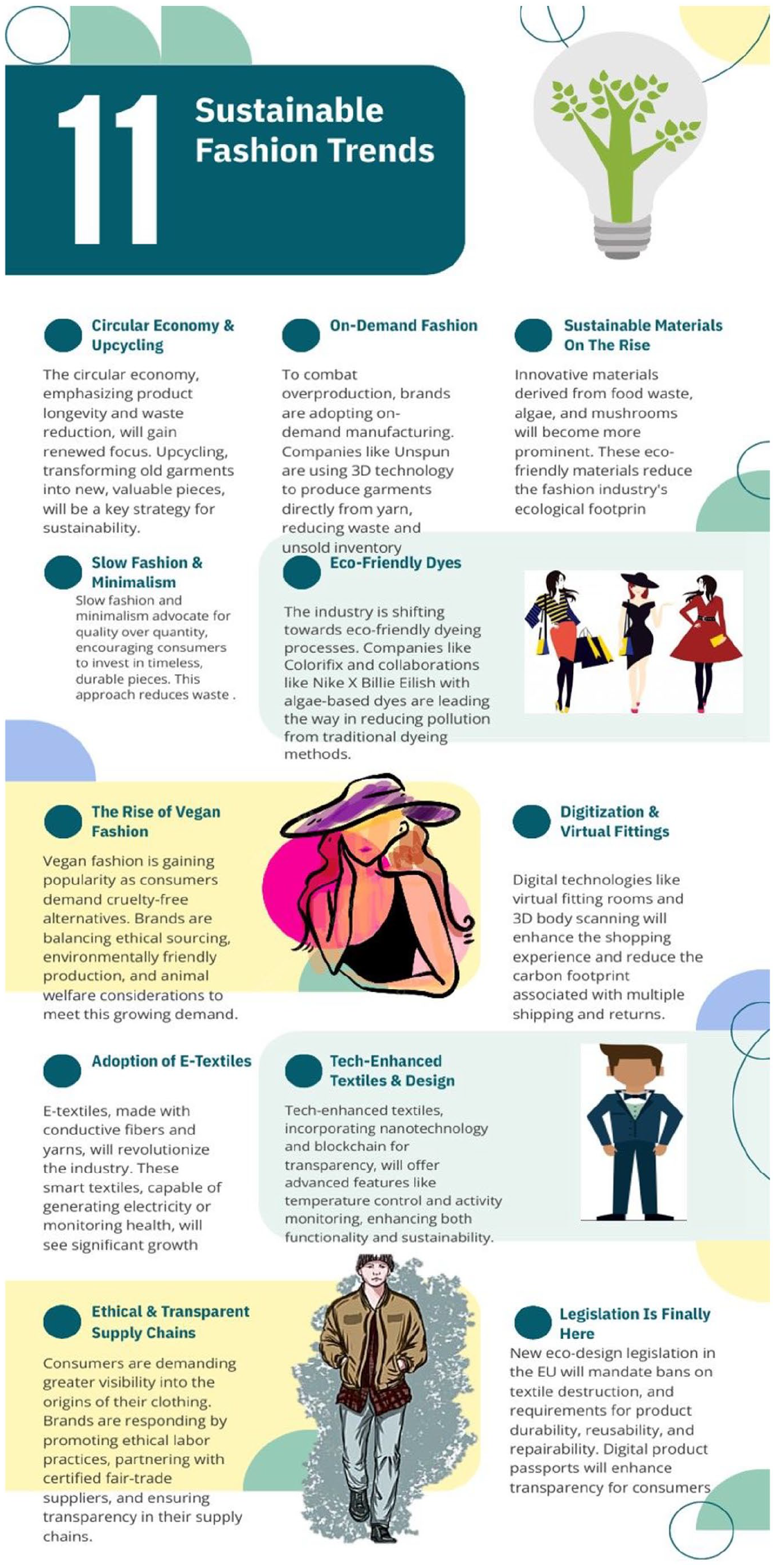 Sustainable fashion has started to become a trend due to the disastrous effects of the fast fashion industry on the environment and social costs. In an increasingly aware world where concerns like climate change, resource scarcity and slave labor are becoming more widely shared, both consumers and brands alike are gravitating toward more sustainable ways of doing business. This movement includes sourcing materials, manufacturing and the lifespan of these clothes. A particular fashion trend that sticks out is how eco-friendly materials are becoming commonplace within the fabric-production revolution. Cotton used traditionally is typically water-intensive because of the high number of pesticides and results in soil erosion. 73 Conversely, sustainable brands are choosing organic cotton, hemp, bamboo and other natural fibers that have a smaller environmental footprint in addition to using fewer resources.74,75 Recycled material, for example, recycled polyester from PET bottles is also being underestimated as a solution in order to waste less and go circular Ethical Production. It’s another important key to sustainable fashion. Respectful treatment of workers and living wages and safe working conditions throughout the supply chain. Enter the age of brand transparency, as businesses swiftly embrace and communicate not just the products and services but the truth about how they source and manufacture the products so consumers can feel good when purchasing things. Programs like fair trade certification, partnerships with ethical suppliers encourage social equity in the industry. Trends in sustainable fashion in illustrated in Figure 1.