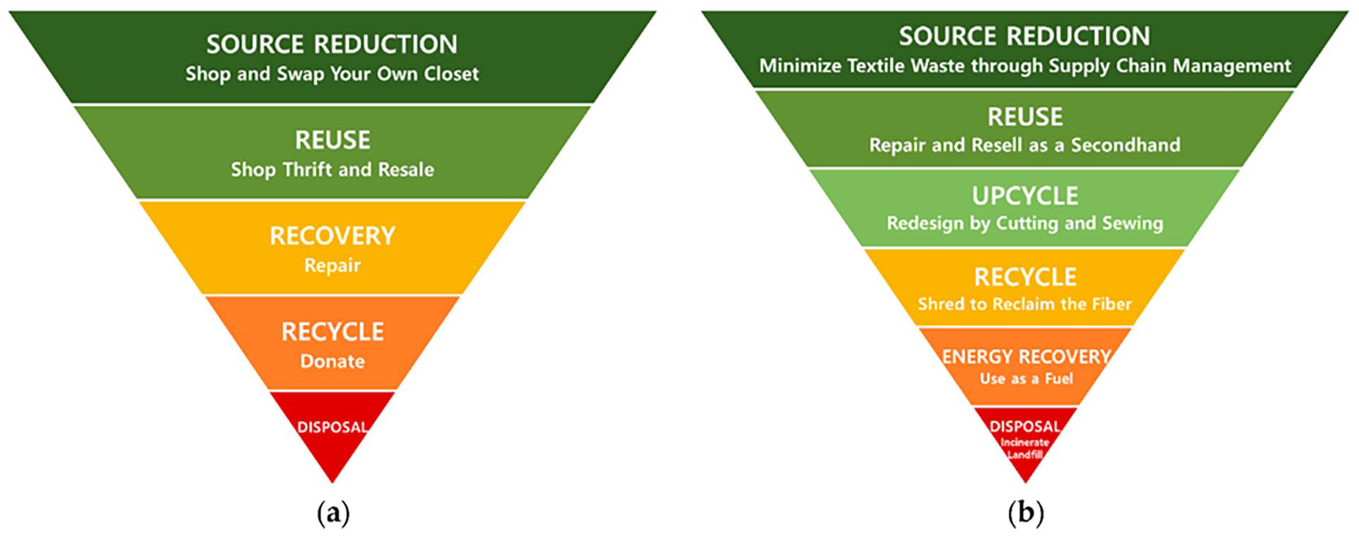The hierarchy of textile waste, for consumers (a) and fashion companies (b).