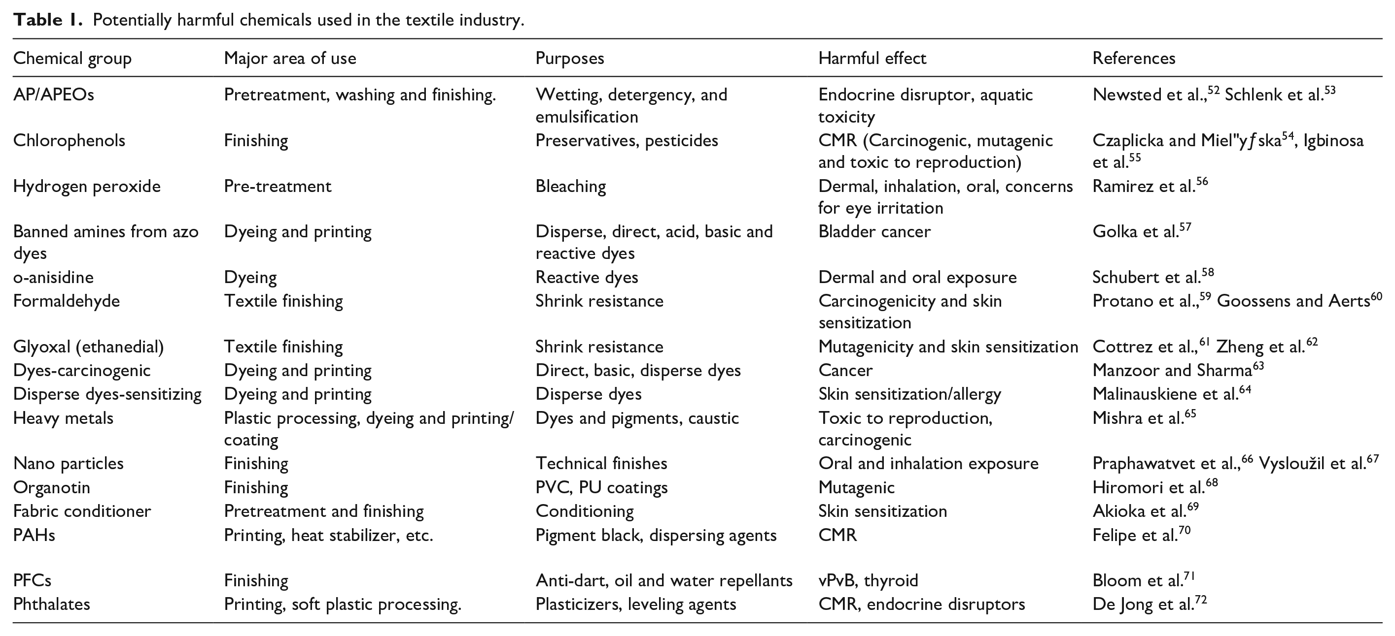 From the extraction of raw materials through the production and disposal of garments, the textile industry is a sector that possesses extensive environmental implications. Starting with cotton, one of the most commonly used fibers in textiles, its cultivation accounts for a significant portion of global pesticide use and water consumption.39,40 Moreover, the processing of cotton into wearable fabric involves intensive chemical treatments, such as bleaching and dyeing, that release harmful substances into waterways and contribute to pollution. 41 Synthetic fibers like polyester, derived from non-renewable sources like petroleum, have own set of environmental challenges. 42 The production of polyester releases greenhouse gases and consumes large amounts of energy, further contributing to climate change. 43 Beyond the production phase, the textile industry faces issues of waste management. Synthetic materials in textile waste, such as production scraps and old garments, can take hundreds of years to break down in landfills. 44 Even when textiles are incinerated, the process releases toxins into the air. 45 In addition, the fast fashion model perpetuated by the industry encourages overconsumption, leading to increased textile waste and a higher demand for production, hence exacerbating environmental impacts. 46 However, there has been a growing awareness within the industry and among consumers regarding the need for sustainable practices. Initiatives like sustainable sourcing of materials, implementation of recycling and upcycling processes and adoption of eco-friendly production techniques are being increasingly embraced by some companies.47–49 Technical textiles manufacturing like antimicrobial, e-textiles, self-cleaning textiles can also be a part of sustainable production. 50 These products can be prepared enforcing in recycled materials as most of them can be used for one time only like bandages with an antimicrobial finish. 51 Furthermore, the rise of circular fashion concepts, aiming to close the loop on textile production and consumption by promoting durability, reusability and recycling, shows promise in mitigating the industry’s environmental footprint. By working together for sustainability, the textile industry can become a responsible and environmentally conscious business that reduces its impact on the planet. Chemicals that pose health risks when used in the textile industry are shown in Table 1.