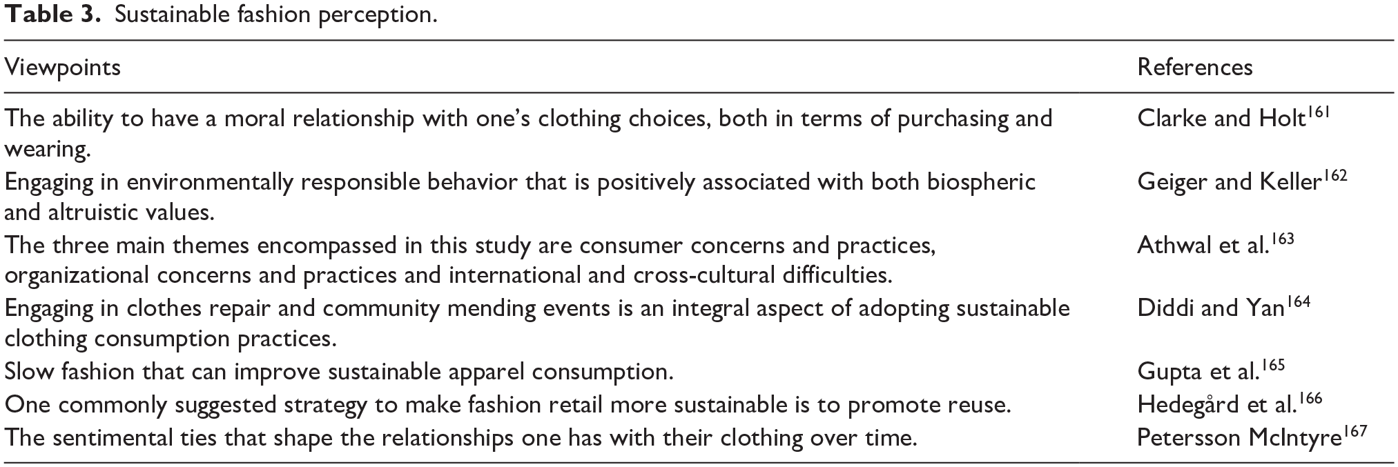 Ethical and environmental concerns are having a greater impact on how consumers view sustainable fashion. Climate change, resource depletion and the fashion industry’s labor practices have all contributed to a discernible trend in recent years toward more conscientious consumer behavior. Brands that are transparent about their supply chains, use sustainable materials and advocate for fair labor conditions are increasingly likely to have consumer support. 159 Many buyers now prioritize sustainable products and are prepared to pay more for those that reflect their morals. 160 But there are still obstacles to ensuring consistent practices across the industry and to educating consumers about sustainable fashion. The demand for sustainable fashion is expected to keep rising as more and more people become aware of the issue and have easier access to information. This will have an impact on consumer preferences and industry standards. Table 3 gives an overview of them perception of sustainable fashion.
