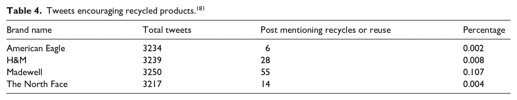 Advertising on recycled clothing is a great way for companies to reach people who are concerned about the environment. An engaging brand story that highlights sustainability, ethical manufacturing and environmental consciousness is essential. 179 The values of eco-conscious consumers should be reflected in the brand’s identity. Successful advertising can include displays of production methods, reuse of materials and explanations of other positive effects on the environment. 180 Awareness of a brand can be increased through social media, influencers and eco-friendly collaborations. Promoting recycled apparel’s quality and fashion sense while dispelling preconceptions about secondhand clothes helps to gain consumer’s trust. In a study, it was found that brands are promoting its unique recycled products through social media platforms like “X” which was commonly known as Twitter earlier and the data is shown in Table 4.