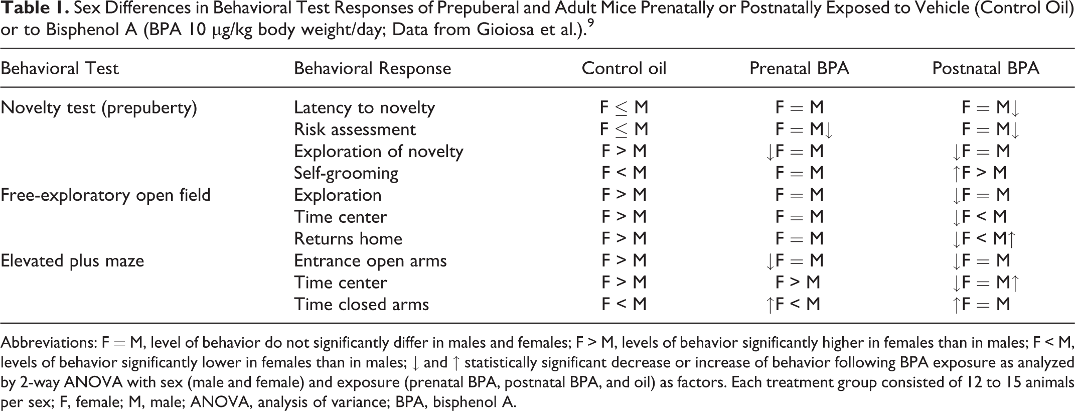 Abbreviations: F = M, level of behavior do not significantly differ in males and females; F > M, levels of behavior significantly higher in females than in males; F < M, levels of behavior significantly lower in females than in males; ↓ and ↑ statistically significant decrease or increase of behavior following BPA exposure as analyzed by 2-way ANOVA with sex (male and female) and exposure (prenatal BPA, postnatal BPA, and oil) as factors. Each treatment group consisted of 12 to 15 animals per sex; F, female; M, male; ANOVA, analysis of variance; BPA, bisphenol A.
