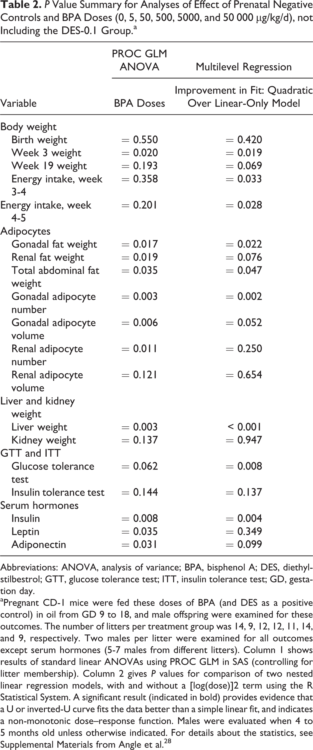 Angle and colleagues 28 conducted a study in which pregnant CD-1 female mice were randomly assigned to the following oral dosing groups: 0 (negative controls), 5, 50, 500, 5000, and 50 000 µg/kg body weight/d BPA or 0.1 µg/kg body weight/d DES (the positive control for low-dose estrogenic effects). We will refer to these groups as negative controls, BPA-5, BPA-50, BPA-500, BPA-5000, BPA-50 000, and DES-0.1; the number of litters per treatment group was 14, 9, 12, 12, 11, 14, and 9, respectively. On PND 1, the sex and weight of mouse pups were determined. The pups were then not handled until weaning except to change cage bedding and then only after the pups were at least 1 week old. Offspring were weaned on PND 22 and housed 2 to 4 of the same sex in polypropylene cages with corncob bedding. At this time, animals were individually identified by an ear-notch pattern. After weaning, animals were fed soy-based Purina 5001 rodent maintenance chow (with only 4% fat) ad libitum; food was weighed every 3 to 4 days to monitor food intake per week; and body weight gain per week was also determined for the duration of the study, which ended when males were about 5-month old. Metabolic energy consumed per week was calculated (for Purina 5001 chow, this is 3.04 kcal/g feed). The following measures and test data were recorded: (1) birth weight, body weight from weeks 3 to 19, and metabolic energy consumption per week; (2) gonadal and renal fat pad weight, adipocyte number, and adipocyte volume; (3) liver and kidney weight and liver histopathology (ie, association of hepatic steatosis with obesity and metabolic disease); (4) glucose and insulin tolerance tests; and (5) serum hormones (insulin, adiponectin, and leptin).