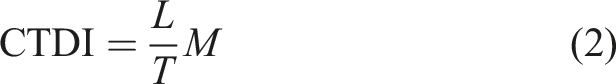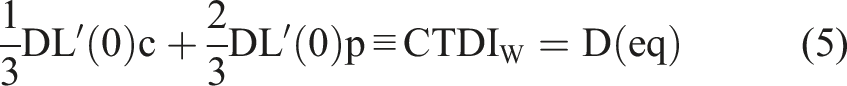 Equation (2) yields a CTDI of 10 (au) for L = 100 mm and T = 10 mm. This is the same value of the dose absorbed in the patient slice obtained above by adding the dose contributions as shown in Figure 1. This numerical equivalence is crucial because it indicates that the CTDI value of a clinical CT scan is a dosimetric indicator estimating the dose in a patient slice. The weighted CTDI is the average dose over the central slice of a series of contiguous slices obtained during a head or body CT examination.5,6 The CTDI measured using dosimetric phantoms is also referred to as the weighted computed tomography dose index (CTDIw). It is given by the following equation: