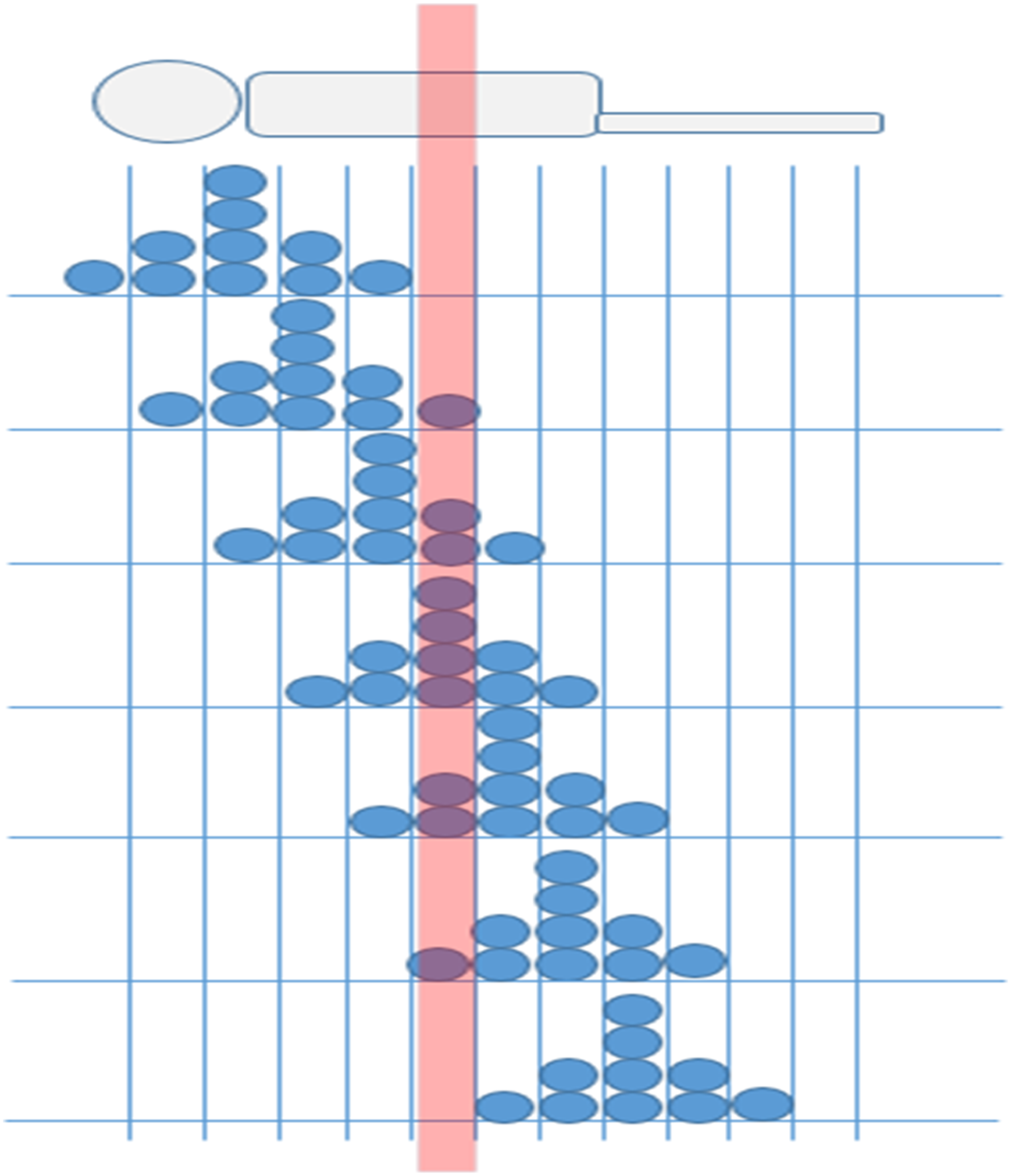 where each circle represents a unitary dose expressed in arbitrary units. The dose absorbed in the patient slice of interest (highlighted in the figure) is given by the five central CT irradiations in the figure. The figure also shows that the first and final irradiations (placed at a distance from the slice of interest) do not contribute to the dose in this anatomical region. Consequently, the dose in the patient slice of interest is given by adding the contributions in the slice of interest (highlighted in the figure). It is equal to 10 in arbitrary units (Figure 1). The typical dose profile in a sequential computed tomography (CT) examination is moving along the