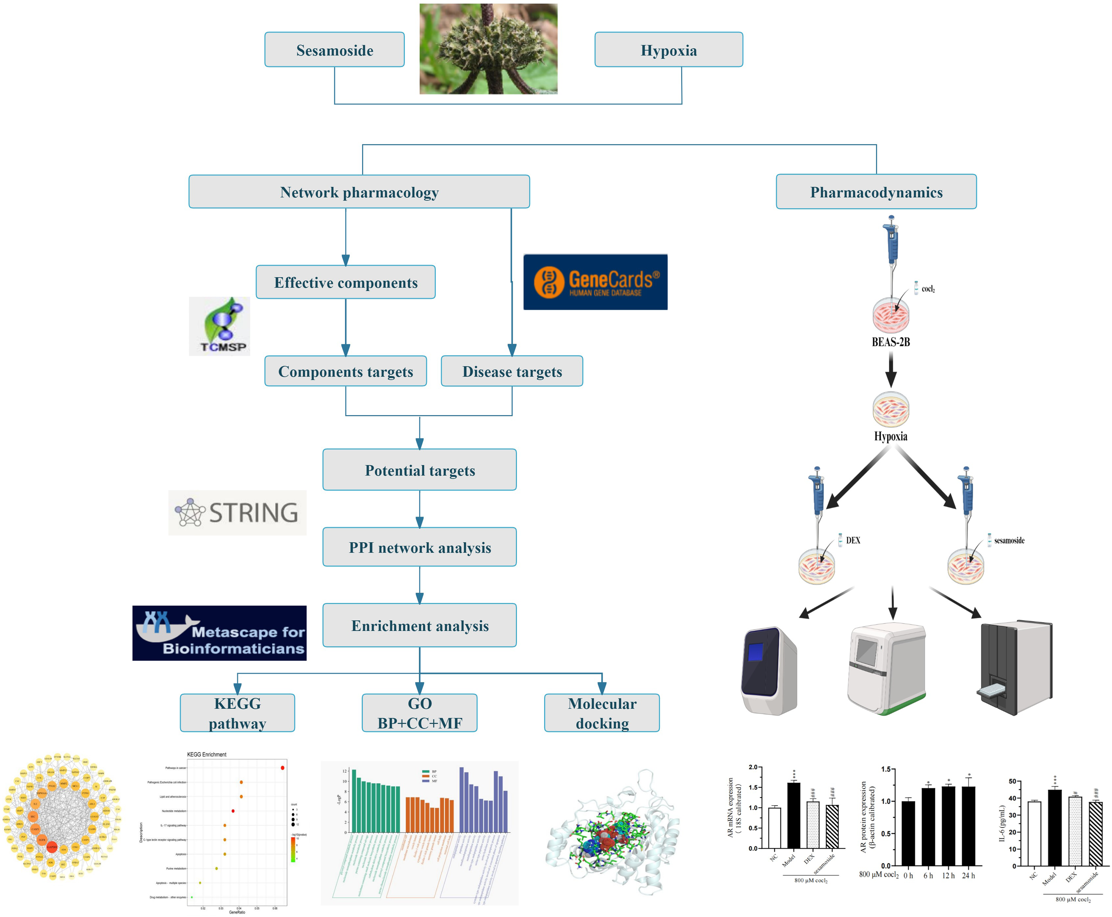 In conclusion, by constructing a network model, predicting and validating target interactions, and integrating multiple omics data, the targets, signaling pathways, and biological functions of sesame glycosides in combating high-altitude hypoxia were explored and predicted. Our study underscores the potential of sesamoside as a novel anti-hypoxic agent with pleiotropic effects. The identification of AR as a key target of sesamoside’s actions sheds light on the underlying mechanisms of its anti-hypoxic effects. Experimental validation confirmed that sesamoside significantly modulates AR expression and reduces inflammatory cytokines, thereby mitigating hypoxia-induced cellular damage. This work provides a comprehensive theoretical basis and experimental foundation for the potential application of sesamoside in the prevention and treatment of hypoxic diseases.