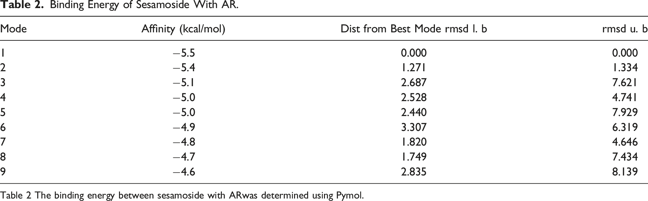 Table 2 The binding energy between sesamoside with ARwas determined using Pymol.
