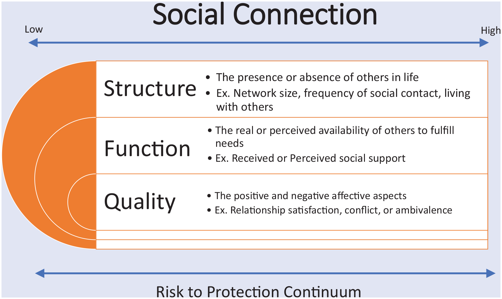 Social connection is an umbrella term that comprises the converging evidence demonstrating that the structure, functions, and quality of social relationships all contribute to health and well-being (see Figure 1). The varying conceptual and measurement approaches used in the literature have been categorized into those that examine the existence of relationships and social roles (structure), the actual or perceived availability of support or inclusion (function), and the positive and negative affective qualities (quality) of social relationships. 6 Each of these approaches consistently predicts morbidity and mortality, 5 but are not highly correlated, suggesting each may be contributing to risk and protection independently. 6 Furthermore, the meta-analytic data on mortality found that the odds of survival was 91% among studies using multidimensional assessments of social relationships 91%, compared with 50% when averaging across studies that assessed individual components. 5 Thus, this suggests that approaches using “social connection” as a multifactorial risk and protective factor 6 may be more ideal than focusing on any one particular component.