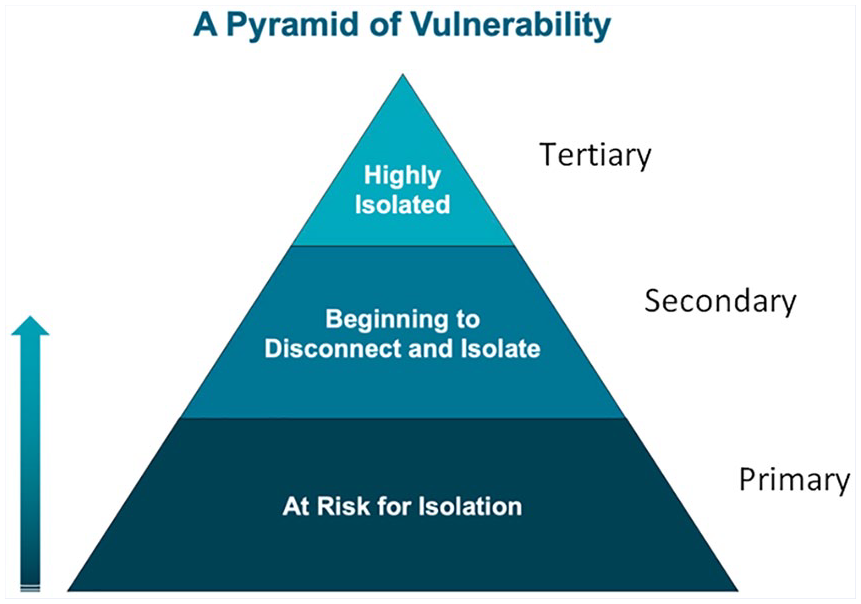 Pyramid of vulnerability to guide assessment, prevention, and treatment of social isolation and loneliness.