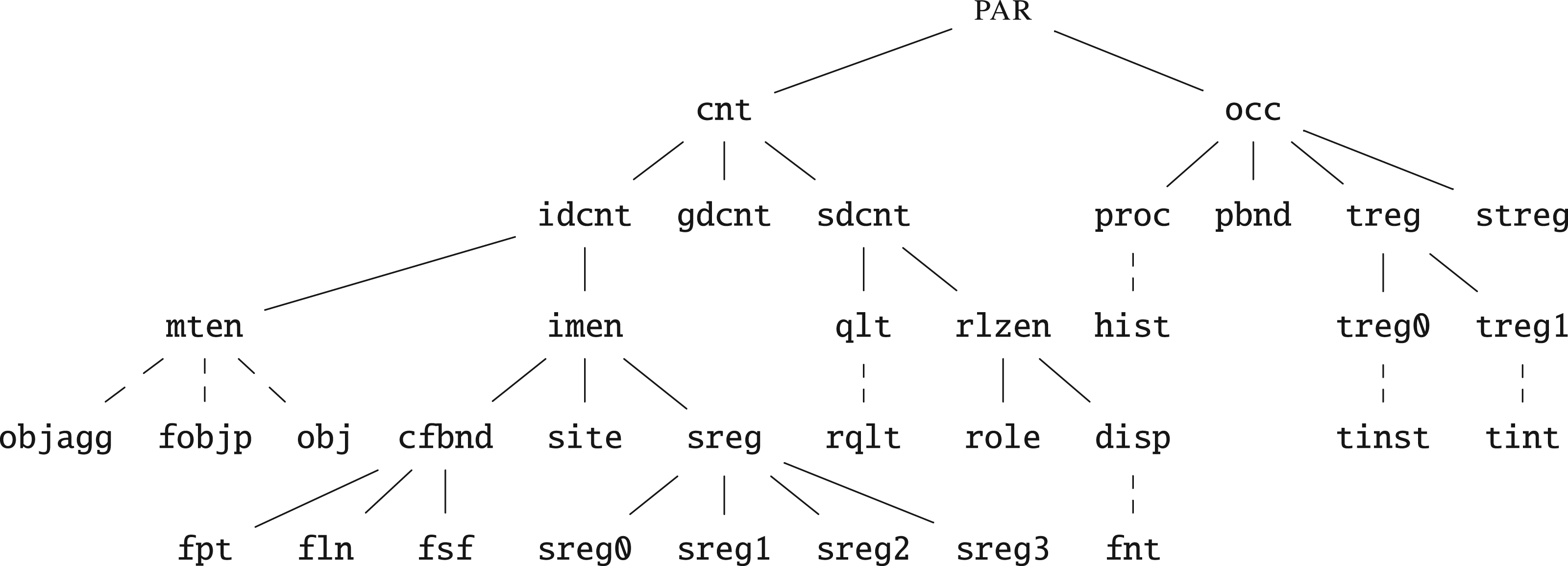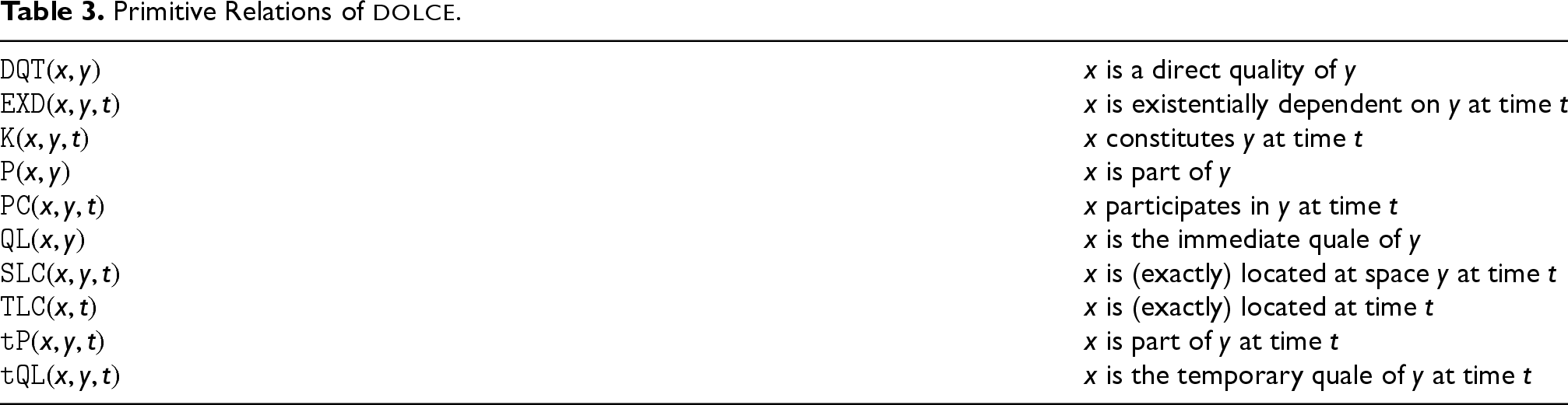 is a top-level ontology, motivated by a cognitive view of reality, and designed to support sharing of data, information and knowledge across all domains. was developed in early 2000 as part of the European project ‘WonderWeb’6, published in the WonderWeb Deliverable 18 (Masolo et al., 2003), and is axiomatised in FOL extended with modalities, namely, the standard necessity and possibility operators. has been applied in a number of areas, in several European and international projects, and is also provided in application-oriented versions in OWL, in particular: -lite, -ultralite, and -zero. The ontology is consolidated as it has been only minimally changed over the years making it the most stable top-level ontology worldwide. The one considered in this paper is the presented in 2020 as part of the standard ISO 21838 (part 3) (ISO 21838-3, 2023). This version is axiomatised in CL (CLIF) (ISO 24707, 2007) and in the Web Ontology Language (OWL), as required by the standard.