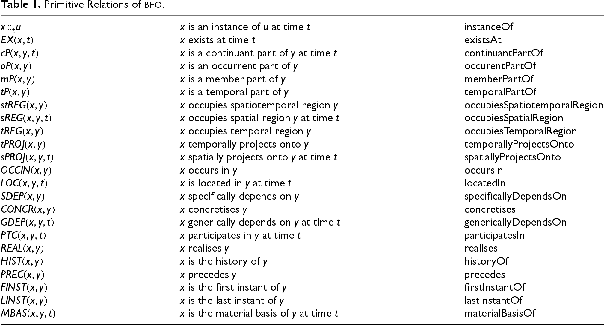 is a top-level ontology, motivated by a realist philosophical position, intended to represent entities as described by science and designed to support information integration, retrieval, and analysis across all domains of scientific investigation. has been under development since around 2002 (Grenon et al., 2004) and serves as the top-level ontology of the Open Biological and Biomedical Ontology Foundry (OBO)4 and the Industrial Ontology Foundry5. has changed considerably over the years and today there are several versions available. The one considered in this paper is the presented in 2020 as part of the standard ISO 21838 (part 2) (ISO 21838-2, 2021). This version is axiomatised in CL (CLIF) (ISO 24707, 2007) and in the Web Ontology Language (OWL), as required by the standard.
