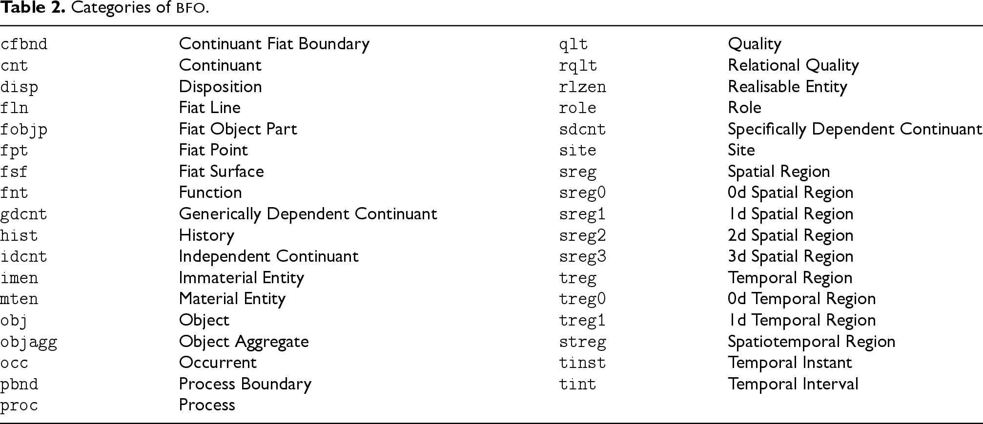 SmithB.AlmeidaM.BonaJ.BrochhausenM.CeustersW.CourtotM.DipertR.GoldfainA.GrenonP.HastingsJ.HoganW.JacuzzoL.JohanssonI.MungallC.NataleD.NeuhausF.OvertonJ.PetosaA.RovettoR.RuttenbergA.ResslerM.RudnikiR.SeppalaS.SchulzS.ZhengJ. (2020). Basic formal ontology 2020 - specification and user’s guide (revised version from september 9, 2020). Technical report.