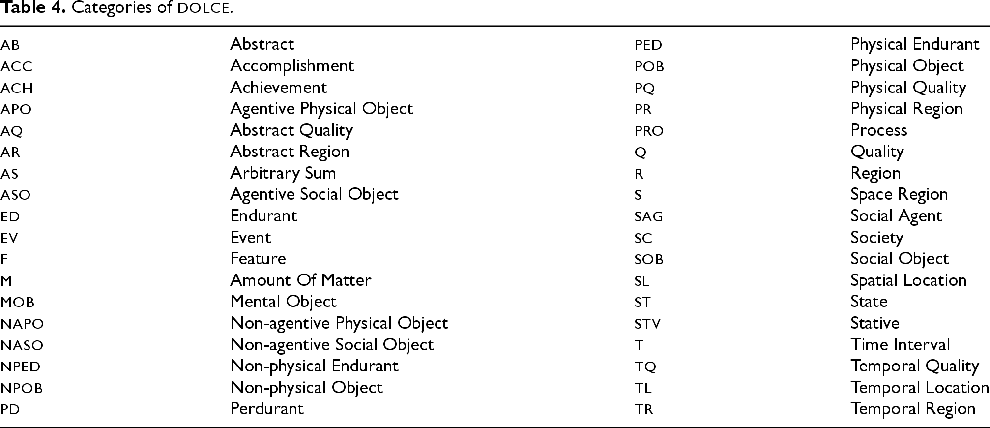 BorgoS.FerrarioR.GangemiA.GuarinoN.MasoloC.PorelloD.SanfilippoE. M.VieuL. (2022a). DOLCE: A descriptive ontology for linguistic and cognitive engineering. Applied Ontology, 17(1), 45–69.