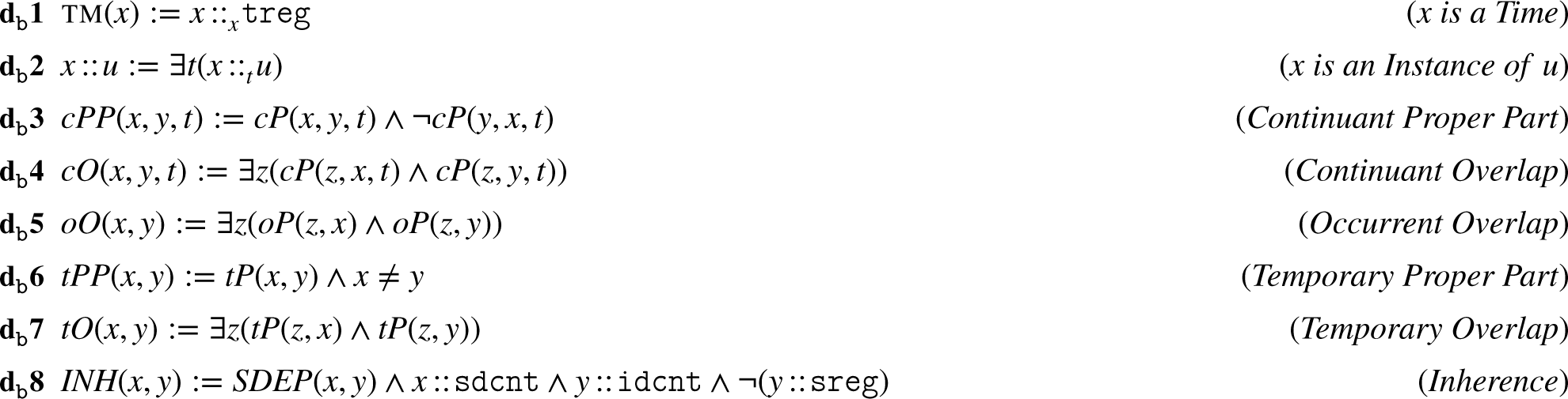 One may think that the mapping given by these definitions is too restrictive: In dolce physical and non-physical endurants are not limited to, respectively, independent continuants and generically dependent continuants (the latter are a quite special kind of entities), and so on. This may suggest to include as well as , but not the converse formulas. However, we need to remember that we are considering the mapping from bfo to dolce. The starting point is the domain of bfo, that is, we need first of all to try to classify the entities that belong to the domain of bfo in terms of the categories of dolce. By looking at the mappings it is easy to see that all the particulars25 of bfo are classified in terms of dolce categories except for spatiotemporal regions:26 (i) independent continuants which are not spatial regions are mapped to physical endurants; (ii) spatial regions to space regions; (iii) generically dependent continuants to non-physical endurants; (iv) specifically dependent continuants to dolce qualities; (v) process and process boundaries to perdurants; and (vi) temporal regions to time intervals. The fact that dolce intuitively accepts, for instance, additional physical or non-physical endurants suggests that, in general, dolce has a domain of particulars larger than the domain of particulars of bfo. Our methodological choice (M3) does not allow the mappings to ‘enrich’ the domain of bfo with new entities. However, by introducing the mapping at the semantic level, that is, in this case, as an operator translating any bfo-structure into a dolce-structure, one could enrich the original domain of bfo by set-theoretically building new entities. This is the approach followed in the literature to map theories of time based on points to theories based on intervals, see (Van Benthem, 1983). The theory based on intervals does not admit points, but points can be built as sets of intervals satisfying a certain relation definable in the theory of intervals. Analogously, one can think of building some entities, for example, statues as opposed to amounts of clay, starting from the amounts of clay and the specific kinds of universals they instantiate. Like in Section 5, the investigation of this kind of ‘semantic mapping’ is not considered in this work.