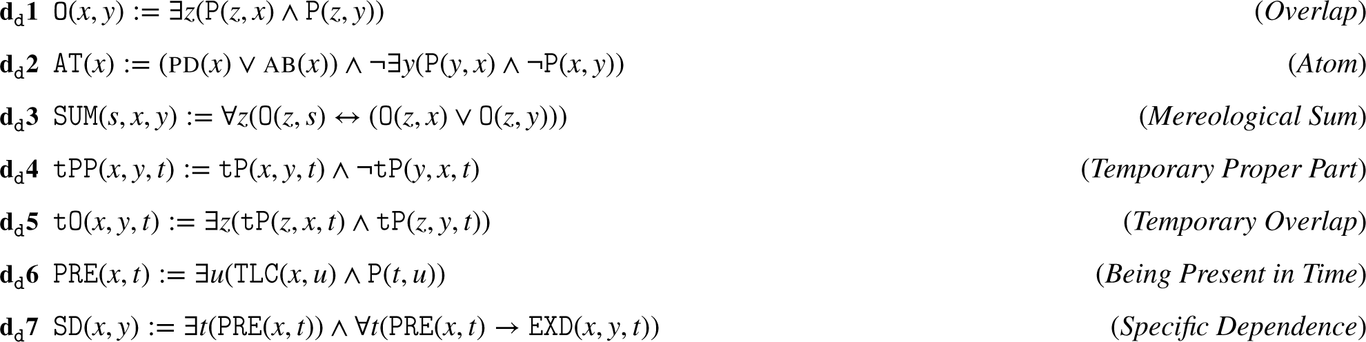 In this way, entities that, for instance, exist at two times but not at their mereological sum would still lack a temporal location but this would not prevent from holding when applied to them (due to the first mapping). We can then try to recover some theorems that do not require at the price of possibly losing the connection between and originally present in . The applicability of this mapping technique to other primitives and its actual consequences are not further studied in this paper.