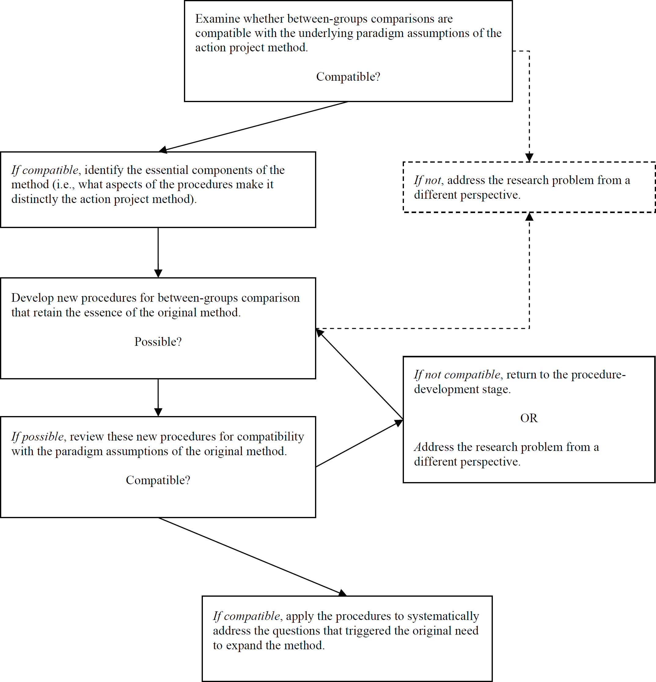 At a broader level, this study provides an example of what might be possible if researchers using other qualitative methods face the same problem of encountering questions related to similarities and differences between groups and finding that the method in question provides no guidance for conducting such analyses. Rather than assuming that such analyses are solely the provenance of quantitative and mixed-methods researchers or adopting the strategy of informally making such comparisons in the Discussion section of their manuscripts, researchers might find it beneficial to extend their methods to answer between-groups types of questions or at least actively explore whether doing so is consistent with the epistemological and ontological stances taken by that method. The process used to expand the action project method (summarized in Figure 1) might provide a useful guideline for how to proceed. Although neither this process nor the possibility of qualitative between-groups comparisons is unique, it is hoped that this example of one successful expansion of a specific qualitative method will encourage more researchers extend to systematically the boundaries of what is possible within their methodological frameworks.
