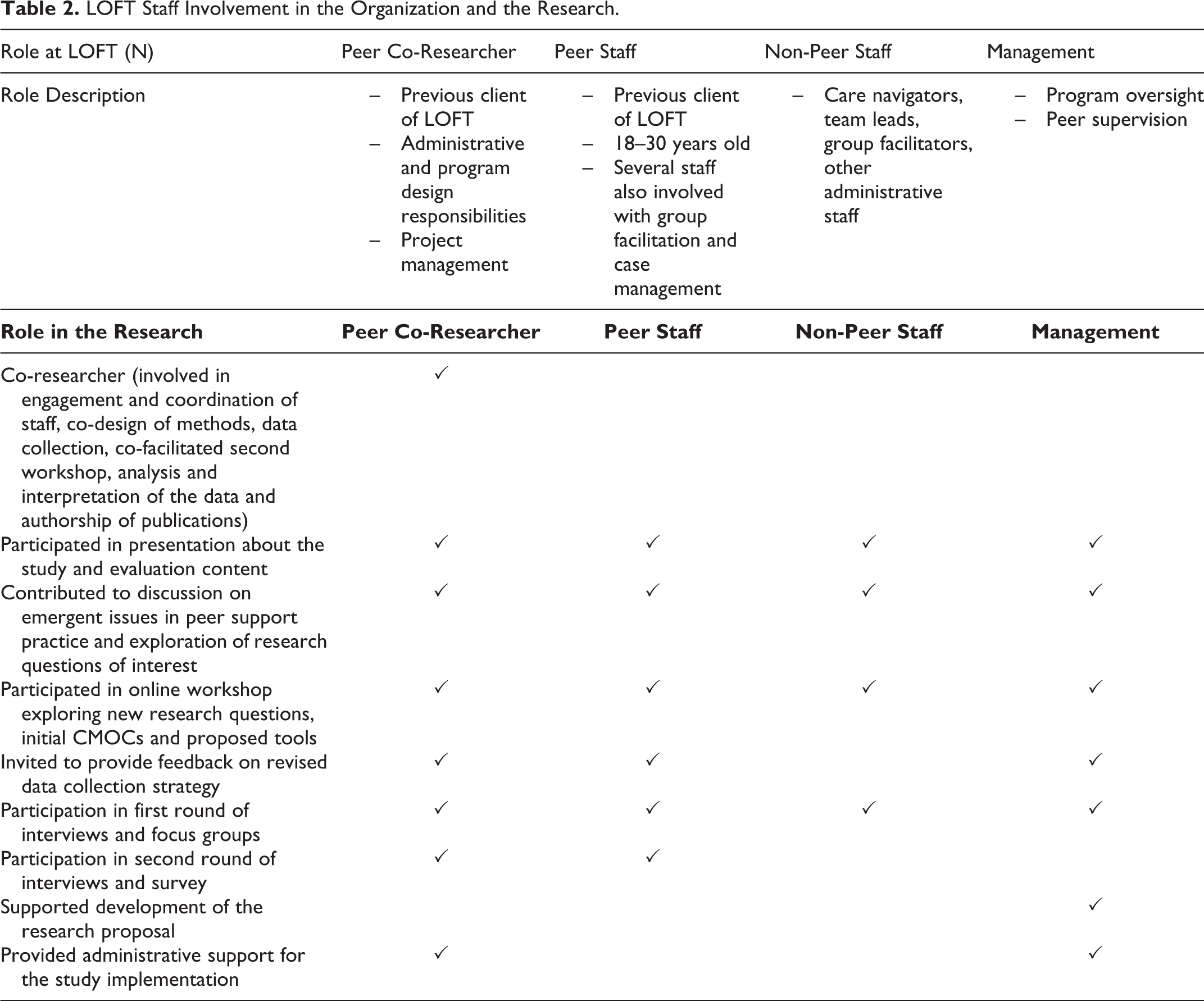 In addition, we conducted semi-structured focus groups and interviews designed to identify preliminary context, mechanism and outcome patterns as well as general successes and challenges in order to refine initial CMOCs. Examples of interview guide questions included: Please describe how peer support services work? From your perspective, can you explain why peer support services are helpful to promote client recovery? What kind of clients benefit most from peer support programming? To achieve saturation within qualitative research, it is recommended that data be collected until no new findings are captured within further interviews (Morse & Maddox, 2014). Recognizing that the key internal program stakeholders represent a limited number of possible participants, we conducted initial interviews with peer staff, non-peer staff (including program administrators) and students that work in the TAY program at LOFT (other participants N = 15; peers N = 8). A second round of interviews (N = 7) were conducted with peers to refine and confirm initial theoretical explanations and to triangulate outcome data. For a summary of staff roles and involvement in the research, please see Table 2.
