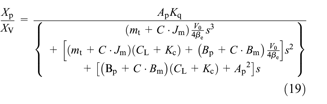 Performing the Laplace transform on equations (13)–(15) to obtain equations (16)–(18), the transfer function between the displacement of 2D piston and displacement of servo valve spool can be put forward as equation (19)
