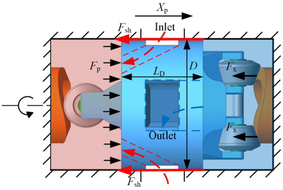 Figure 5 shows the structure schematic of a single metering unit of the 2D piston flowmeter. At this moment, the 2D piston is at the middle of its axial stroke, and the hydraulic spring stiffness of the two displacement chambers have the same value. According to the traditional control theory, the metering unit has the least stability at this time. Therefore, the dynamic response analysis is carried out in this mid-stroke state. At the moment of Figure 5, the flow successively enters the left chamber through the windows on the sleeve and the slots on the 2D piston, and pushes the 2D piston toward right. Meanwhile, under the driven from the motion converting mechanism, the 2D piston rotates in the direction shown in Figure 4. Obeying Newton’s second law, the force balance equation of a piston set can be described by equation (1)