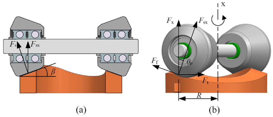 Schematic diagram of the contact forces between the cone rollers and the cam track: (a) Axial component force of the support force on the cone roller and (b) force analysis of cone rollers on the cam track.