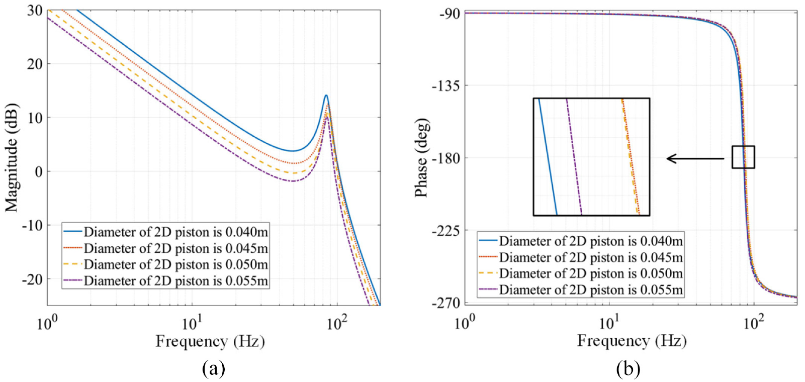 Bode diagram of the system under different 2D piston diameters: (a) amplitude frequency characteristics and (b) phase frequency characteristics.