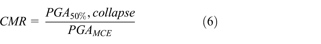 report recommends the use of the CMR as an important evaluation index of structural collapse resistance, which quantifies the seismic collapse safety reserve of the structure.35,36 The larger the CMR value, the lower the collapse probability of the structure, and the higher the safety reserve of the structure against earthquake collapse. In this study, when PGA was used as the ground motion intensity parameter, the ratio of the seismic intensity parameter PGA corresponding to the 50% collapse probability on the fragility curve to the seismic intensity parameter PGAMCE corresponding to the rare earthquake in the structural design was used as the