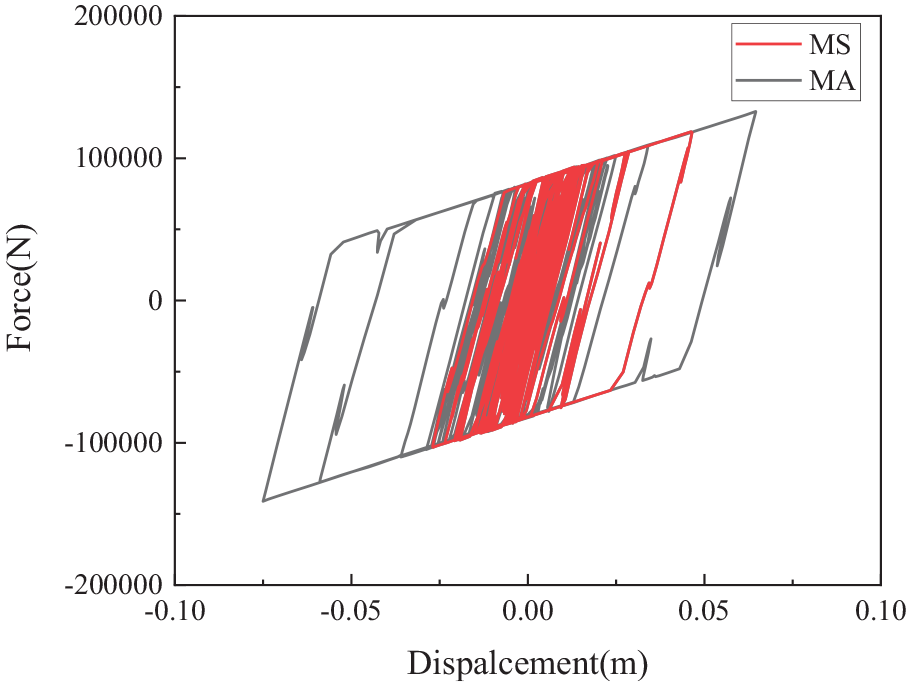 Figure 3 shows the hysteretic curve of the most unfavorable bearing under a fortification earthquake. It can be seen that the hysteretic curve is full, indicating that the established isolated model has better seismic performance and energy dissipation capacity. It can be seen from Figure 3 that the energy dissipated under the action of the mainshock is larger than that under the action of the main-aftershock.