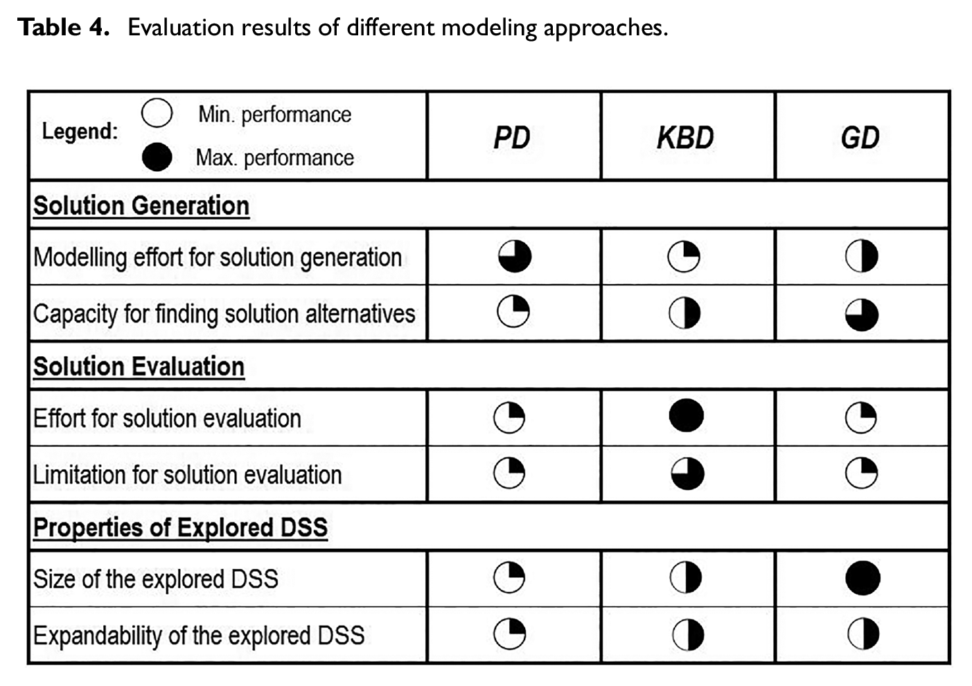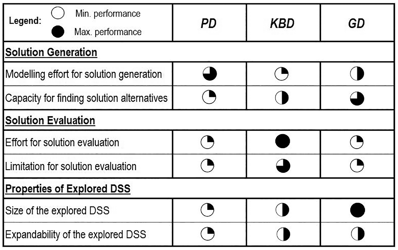 Owning to the automated generation process, GD approach facilitates the iterative creation of a variety of solution alternatives, reducing the effort for expanding the DSS. However, the same production system poses challenges in decision-making and achieving the optimal solution, necessitating additional tools for solution evaluation after each iteration. While the GD approach excels in generating solutions amid changing requirements, the subsequent individual analysis of each solution poses a significant challenge for evaluation. In this regard, GD approach proves superior to the KBD approach for DSS expansion, but not entirely, as it requires additional effort for thorough solution evaluation.