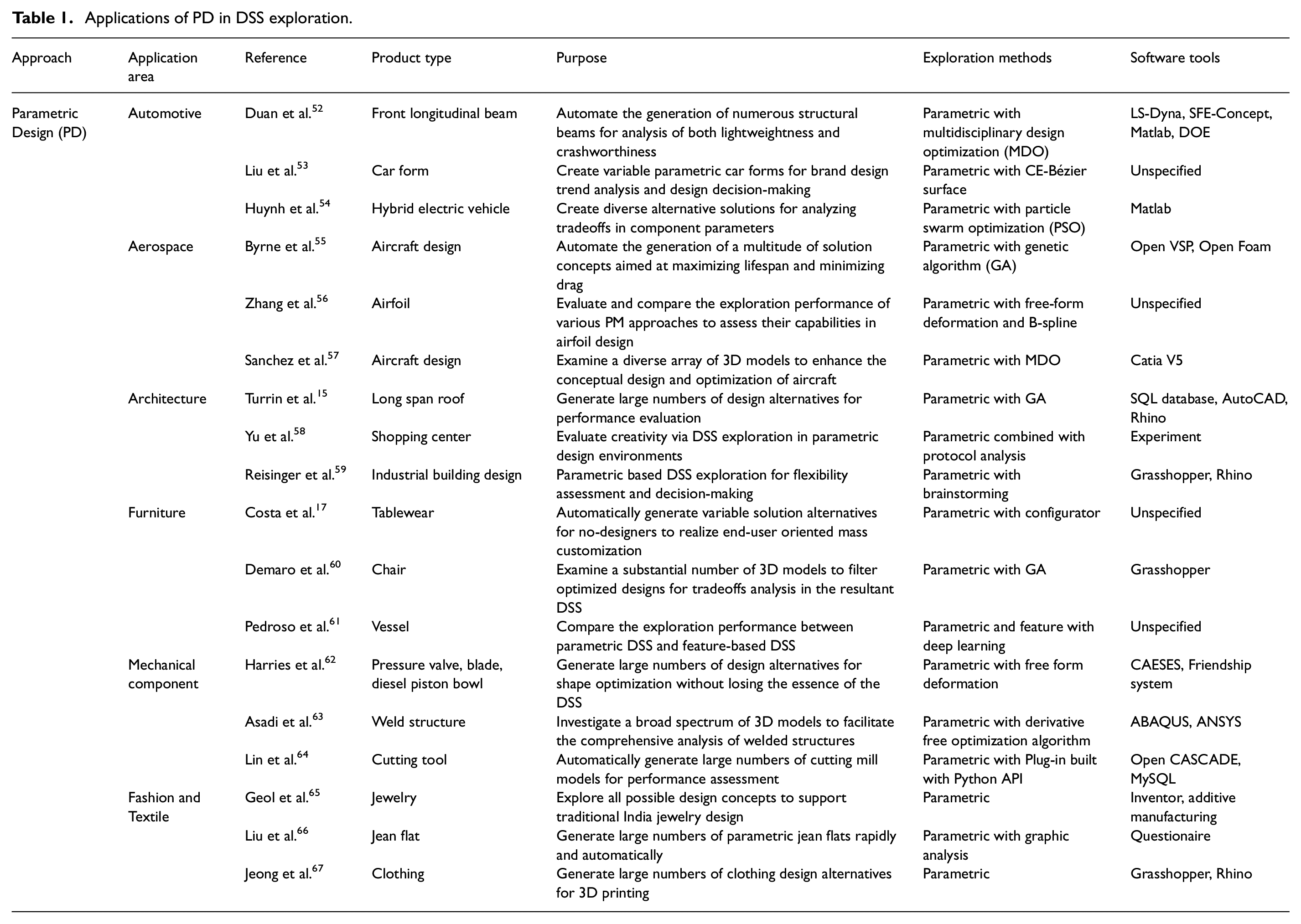 Table 1 summarized part of applications of PD in the last decade. The literature collectively highlights the importance of PD in influencing Decision Support Systems (DSS) across various industries. These industries span from automotive, aerospace, and mechanical engineering to architecture, furniture, and fashion design. These applications contribute to the understanding of how the DSS exploration through PD approach can enhance the efficiency, creativity, and functionality of designs in diverse domains.