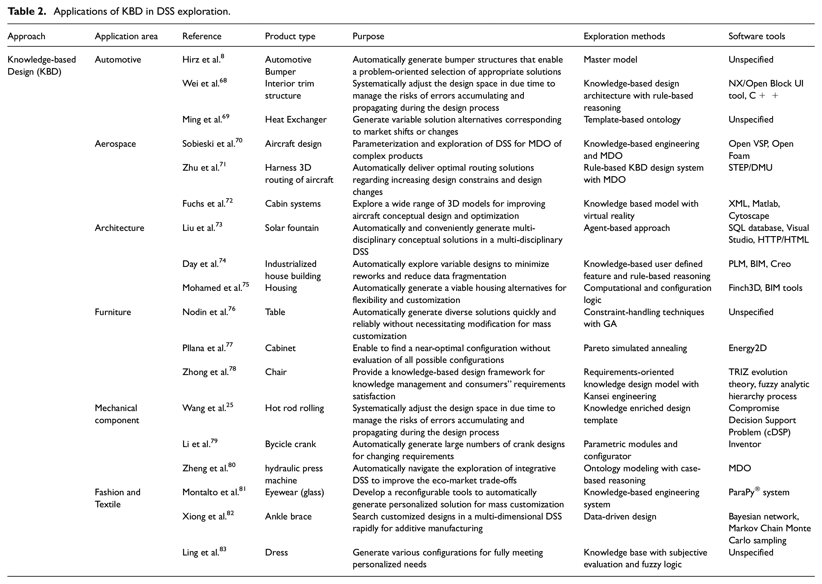 A collection of KBD applications is summarized in Table 2. It is notable that KBD approaches has been already applied in a wide range of topics in the domain of DSS exploration. The collected literature demonstrates the pervasive influence of KBD in shaping and optimizing the DSS across diverse domains. From automotive to aerospace engineering, and from housing design to fashion, the integration of KBD systems consistently proves effective. The studies also underscore the adaptability of knowledge-based frameworks in addressing challenges such as multidisciplinary optimization, mass customization, and intelligent manufacturing. Overall, the collective findings affirm the versatility and effectiveness of KBD across a spectrum of applications, highlighting its pivotal role in navigating the complexities of DSS exploration.