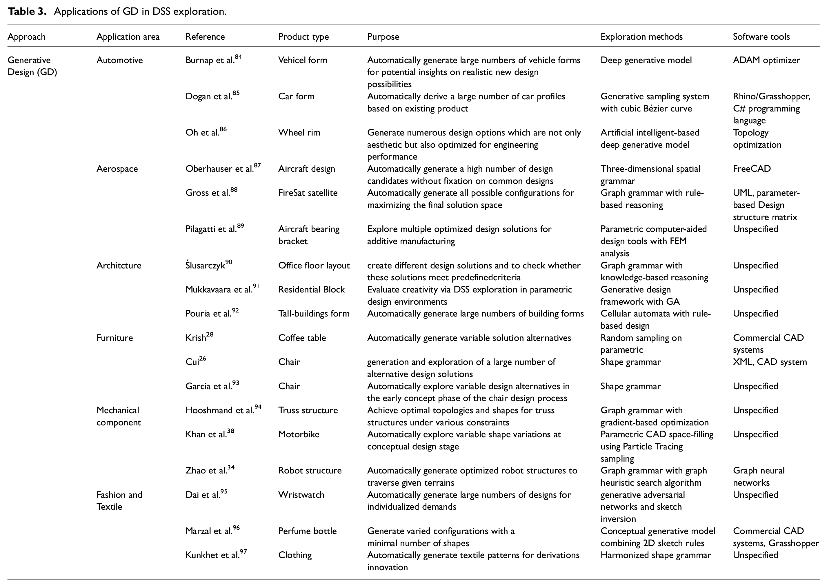 Variable applications of GD published in recent years are presented in Table 3. The collected studies on GD underscores its effectiveness in exploring DSS across diverse domains. From aerospace components to building architecture and robotic systems, the studies showcase how GD approaches contribute to innovative and optimized outcomes. The papers highlight the adaptability of GD approaches in addressing specific constraints, including shape variations, topology optimization, and user preferences. Furthermore, the exploration of GD potential in additive manufacturing and cultural contexts exemplifies its versatility. Overall, the collective findings reveal GD as a powerful tool for creative exploration and optimization in various design domains.