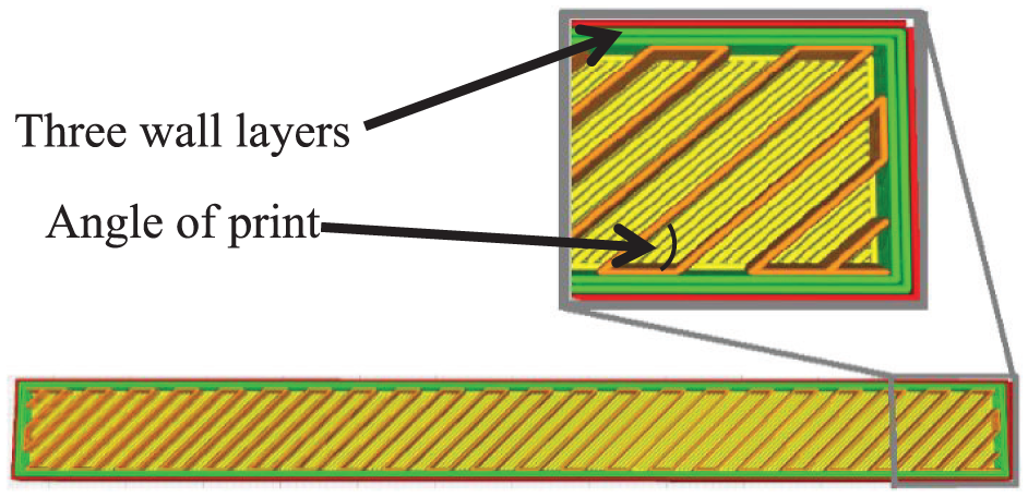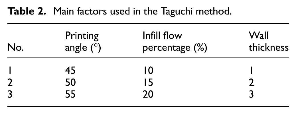 The adhesion between the print model and injection material was to be enhanced by low fill ratios. Their effects on the mechanical properties of the samples were studied at different levels of count of the walls. The printing angles were also chosen, according to a previous research showing a direct influence on the performance of the samples in 3D printing. 22 Table 2 provides the factors and the corresponding levels that were incorporated in the experimental design whereas Table 3 provides the Taguchi L9 orthogonal matrix that was used to structure the experiments. The sample parameters that were used to print are shown in Figure 1. The printing angle (45, 50, and 55) is defined as the build angle of the internal structure, or the angle of the printed layers with regard to the build platform when 3D printing is undertaken.