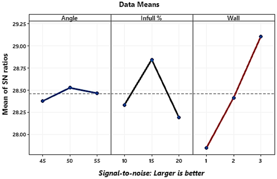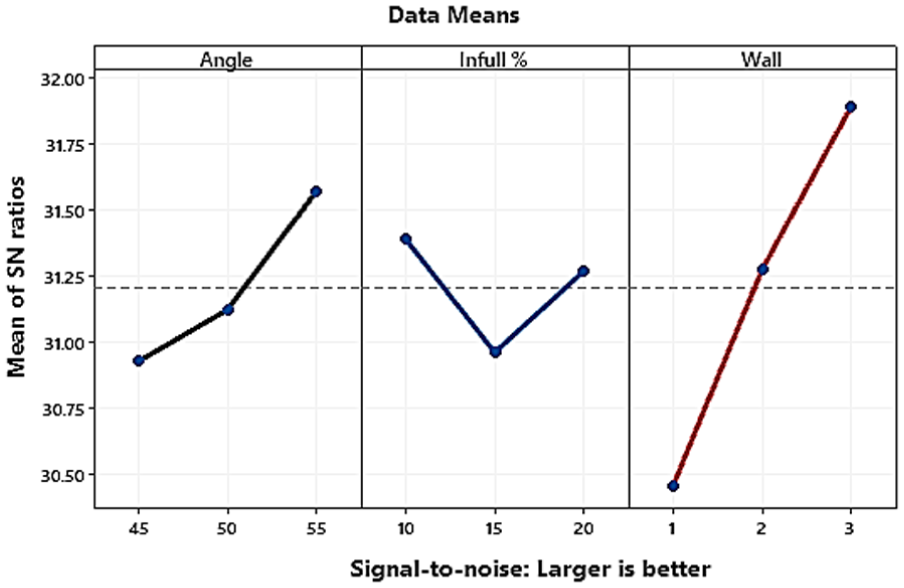 Based on the analysis of the concomitant data by the Taguchi method, the Signal-to-Noise Ratios, and the Larger is better methodology, one can note that the wall thickness is the most significant of them all (Figure 14). Samples that were three-walled performed better compared to those with two or one wall. The impact of the wall thickness reduced progressively with the reduction in the number of walls and the single wall design exhibited a negative influence. The second factor that had the most influence was the printing angles with 55° effective. Conversely, 50° and 45° had an adverse impact on performance. Regarding fill ratio, the best fill ratio was 10% then 20%. Nonetheless, a fill ratio of 15% was showing negative effect.
