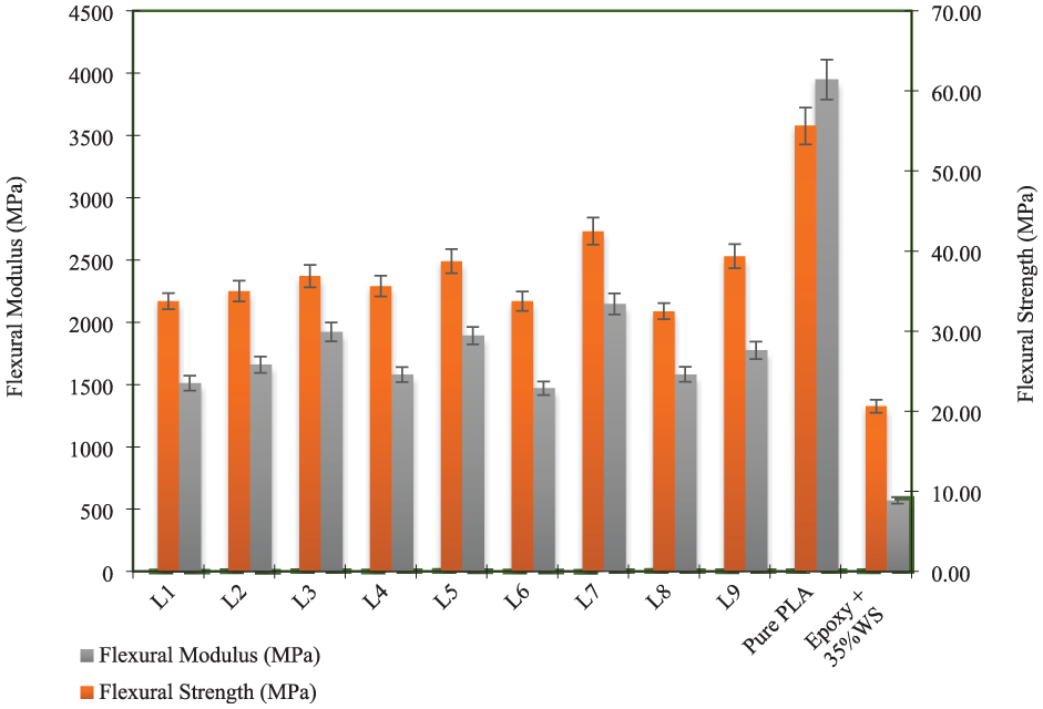 The outcome of flexural tests showed that flexural strength and flexural modulus of PLA reduced significantly after the addition of walnut shells and epoxy. This is an indication of a lower stiffness and a lower capacity of the material to resist loads without deforming or breaking. Figure 12 shows the flexibility strength and flexural modulus of the samples experimented. The flexural strength was detected to lie within the range of 32.5–42.5 MPa and this implies that the efficiency dropped by nearly 24% relative to pure PLA. It however increases by about 52 when compared to the walnut shell and epoxy composite. In the meantime, the flexural modulus was in the range of 1470.59–2147.53 MPa which showed that the efficiency had been decreased by 46% in comparison with the PLA pure sample. On the contrary, it demonstrates a growth of about 73% in comparison to the walnut and epoxy composite.