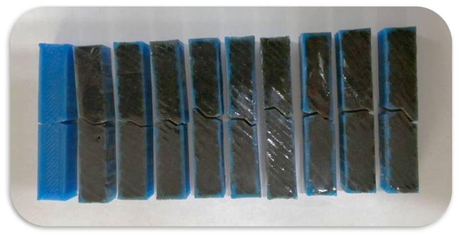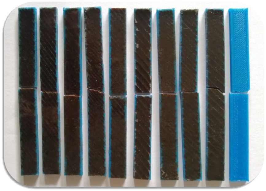 Figure 4 shows the samples after the injection process and their filling with the composite. In particular, Figure 4 shows how the first and the second phases of the research are combined with each other. The optimal composite (35% walnut shells mixed with epoxy) was chosen and injected into the samples produced at the second stage with the help of a syringe into the samples to get the final samples. The mechanical tests were done and the results analyzed to measure the performance of the composite.