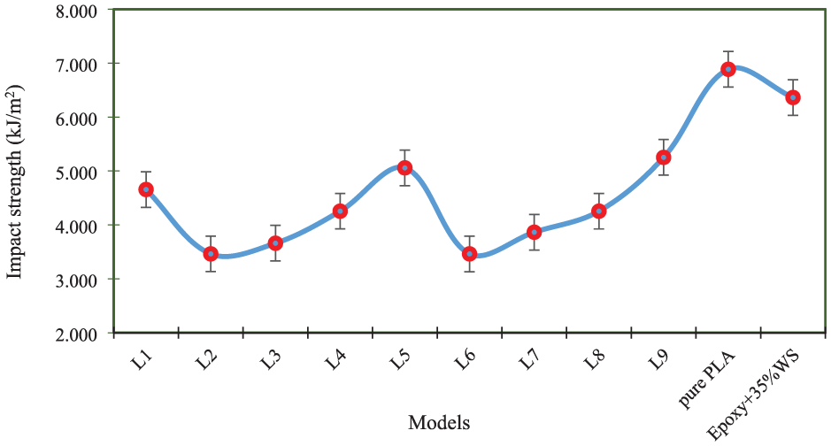 Impact testing is a significant mechanical test that is to examine the aptitude of a material to take in impulse in the occasion of abrupt loads, which is an indication of strength and capacity to break fragmentation. Here, the findings between PLA with filler of walnut shell and epoxy revealed a drastic drop in impact resistance than when using pure PLA which signifies the influence of the additives on lowering the impact resistance of the composite to face abrupt loads. As shown in Figure 15, pure PLA shows a high impact resistance than models with walnut shells and epoxy as internal fillers. The values of impact resistance were 5.25–3.46 kJ/m2. It means that performance reduced by approximately 27% in comparison to the pure material without additives. Comparatively, the values of the impact resistance were however enhanced by about 21% as compared to the walnut and epoxy composite.