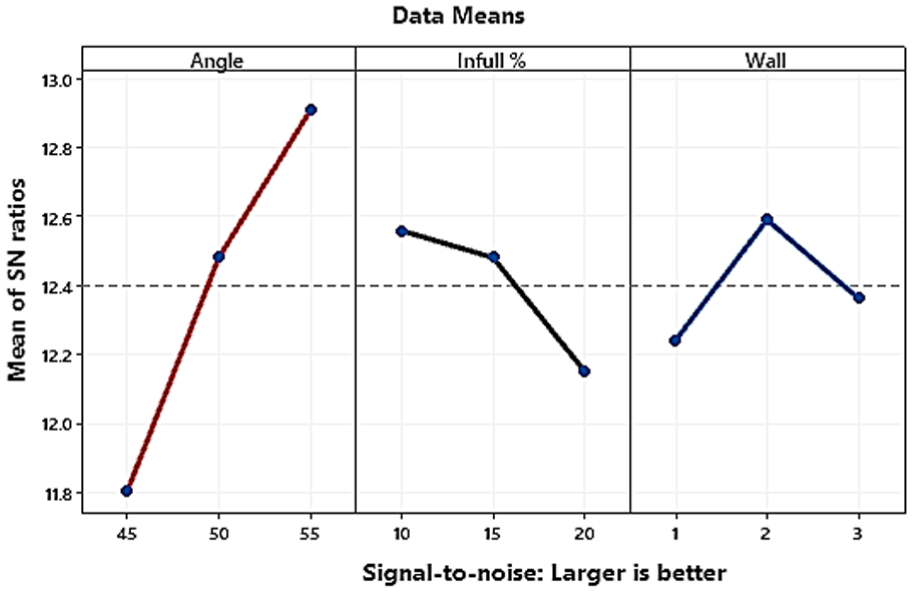It is possible to note the effects of different parameters on the impact resistance of the tested models after analyzing the data aided by the Taguchi technique, signal-to-noise ratios, and the bigger is better method (Figure 17). The printing angle was the parameter that had the greatest impact over the rest of the parameters with the best results being achieved at a printing angle of 55°. This was followed by the 50° and the negative effect was the 45°. Also, it shows a linear relationship, with a decline in the effect with a decrease in the angle. The infill percentage that was the second most influential parameter. The infill percentage of 10% gave the most favorable results followed by 15% whereas an infill percentage of 20% had the opposite impact on the results. Lastly, the impact resistance was least affected by the third parameter, which is the wall thickness. Two walls appeared to be the best configuration of the experiment compared to one wall, and three walls affected the results negatively.