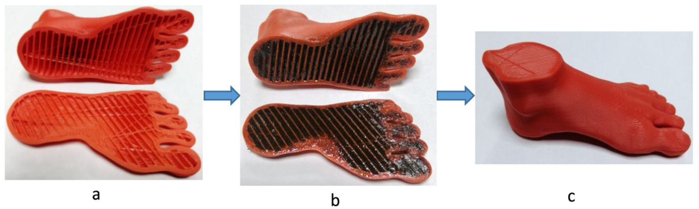 Stages of foot manufacturing: (a) printing the upper and lower foot parts in two sections, (b) impregnating each part with the walnut shell powder/epoxy mixture, and (c) assembling the two parts to obtain the complete foot model.
