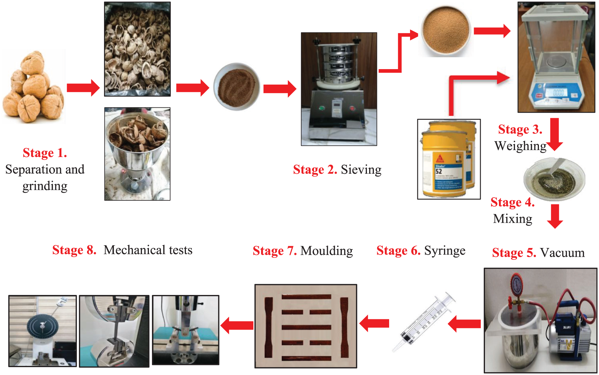 Stages of preparing and manufacturing the walnut shell–epoxy composite and the testing methods.