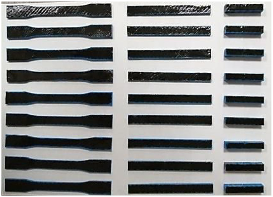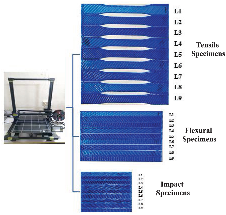The second phase involved printing of 3D models with 100% of fill on PLA filament. These models were further put under tensile, flexural, and impact tests. The other models were produced based on the experiment characteristics in Table 2.