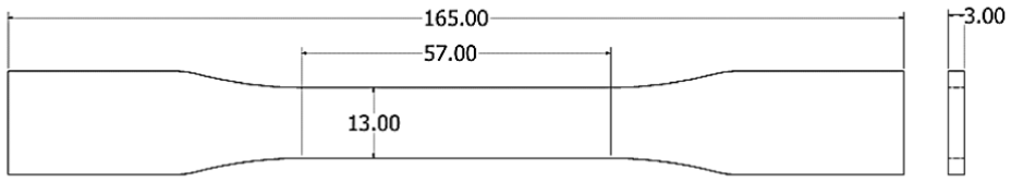The mechanical properties of the samples were investigated through a series of standard tests, beginning with the tensile test, which was conducted in accordance with ASTM D638. This test is used to test the longitudinal resistance of plastic materials. The samples were cut in a typical shape of a dog bone with the dimensions of 165 × 13 × 3 mm as shown in Figure 5. The testing was conducted on a Gotech U60 universal testing machine (Taiwan) at the constant loading speed of 5 mm/min. The highest tensile stress as well as the elongation when breaking was recorded.