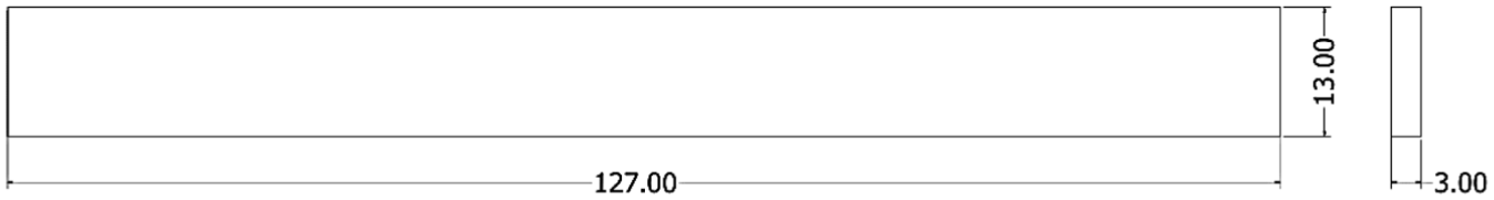 Flexural test was also conducted in ASTM D790 whereby the same testing machine was used but at 2 mm/min loading speed. The samples were rectangular shaped and 127 mm in length and 3 mm in thickness (Figure 6). This test aims at examining how the material reacts to the process of bending and also evaluate its resistance to a constant obliquely distributed load.