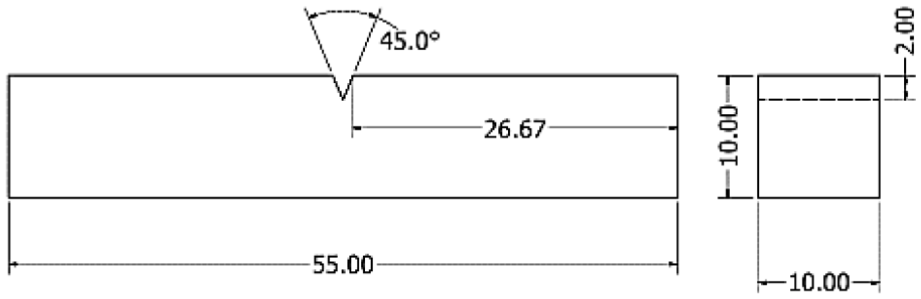 To determine the impact resistance, a Charpy tester (model CIT2105) was employed to determine the capacity of the material to withstand an impulse impact according to the ASTM D256. Specimens were made with pre-established rectangular size (Figure 7). In the experiment, each specimen was hit by a pendulum at a given point and the amount of energy taken by the specimen at the breakage was determined. This test gave a valid clue of the ability of a material to survive sudden loads which is important in determining whether the material is appropriate in use where there is a need to have resistance to sudden shocks and other dynamic changes.