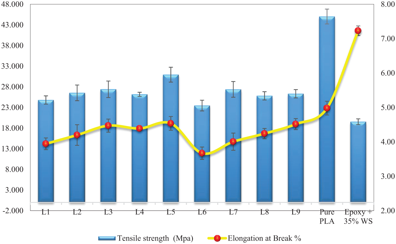 Following an experiment on 10 samples produced using 3D printers, a sample was printed in pure PLA, in 100% infill and no additives. Figure 8 presents the changes in tensile strength of all the samples that were 23.46–30.94 MPa. On this regard it can be observed that the efficiency was lost by approximately 31% when the maximum tensile strength values were compared between Sample L5 and pure PLA sample at a 100% infill density. Moreover, a tensile strength enhancement of about 37% was attained by contrasting the present findings with a hybrid sample consisting of 35% of walnut shell and epoxy resin injected into the 3D printed samples. Figure 8 indicates as well that there are considerable variations in the percentage of elongation at break in all models. The maximum elongation is 4.54% and the minimum is 3.67 with L5 compound showing the maximum elongation. Compared to the pure PLA material, efficiency is reduced by 9%. The performance is however reduced by about 37% as compared to that of the walnut-epoxy composite. Such a decrease in tensile strength and elongation at break can be specified by the fact that the interior structure of the product contains the walnut shells. These additives affect tensile strength and enhance brittleness and cause a decrease in break elongation.