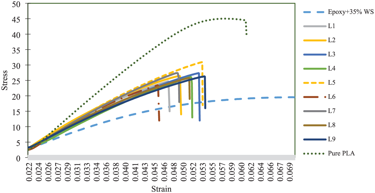 Figure 9 reveals the variation of the stress-strain curves of the nine models, comparing them with a pure PLA specimen and epoxy composite with 35% walnut shells. The epoxy composite that is printed on walnut shells has a greater strain magnitude, and the pure PLA sample has a greater stress.