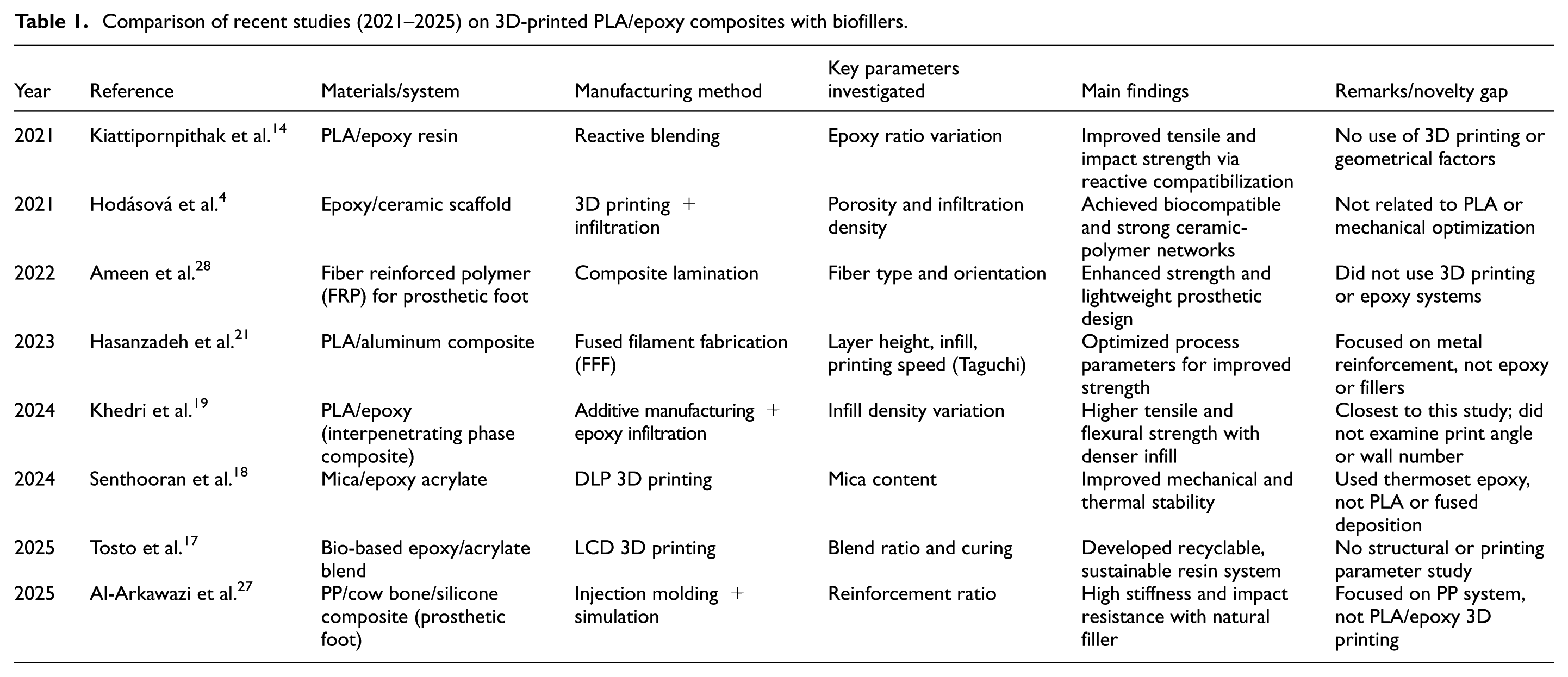 Comparison of recent studies (2021–2025) on 3D-printed PLA/epoxy composites with biofillers.