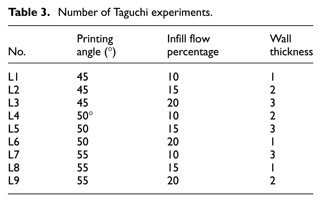 The Taguchi method is a statistical methodology for designing experiments and analyzing experimental results in a way that dramatically decreases the number of necessary experiments while retaining the maximum expected benefit from the available data. Reducing interference allows for cleaner results and improves the quality of the obtained results when isolating variables that most significantly impact model performance. This also requires less cost and time which is good for research with minimum funds. In this vein, the L9 matrix was adopted to reduce the number of experiments to be performed without compromising the precise evaluation and analysis.20–23