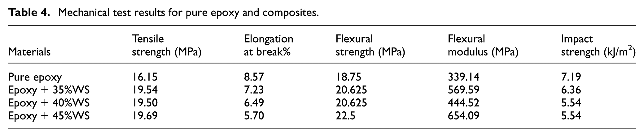 The flexural strength tests showed that all the samples had a gradual increase in strength of between 9% and 17% with an increase in the content of walnut shell. Also, the flexural modulus rose by up to 48% relative to the pure epoxy sample.