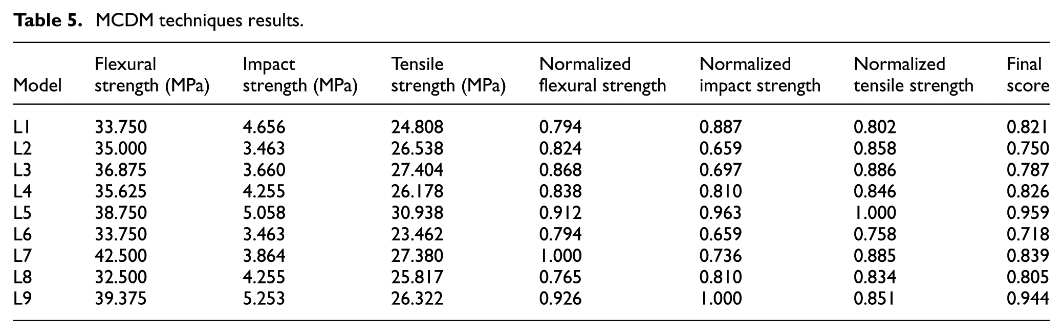 The analyzed findings have revealed that the Multi-Criteria Decision Making (MCDM) method is a reliable and objective technique to classify composite models and select the best model with the consideration of three important mechanical properties in the context of 3D printing of PLA flexural strength, tensile strength, and impact resistance. All criteria were based on the principle of larger is better, and the data were normalized using equation (2) to ensure a consistent scale ranging from 0 to 1.